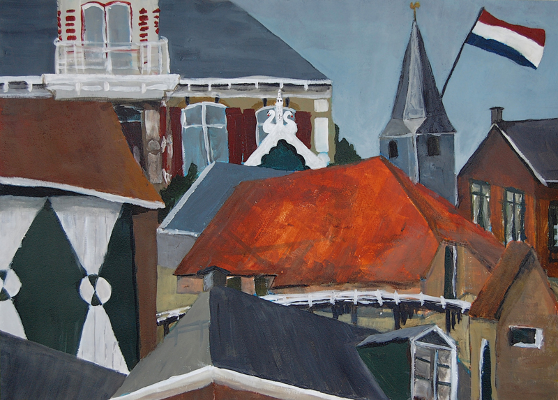 Studie voor het schilderij 'Gaastmeer'. Ik wilde met deze studie uitzoeken wat de impact is van enkele stijlkenmerken van de gebouwen van Friesland op het beeld. Verder bleek uit deze studie dat het rommelig plaatsen van gebouwen afbreuk doet aan het gevoel van weidsheid en ruimte. Onder andere hierdoor ontstond mijn beslissing om alle gebouwen in het schilderij 'Gaastmeer' op een lijn rond de horizon te plaatsen. Verder blijkt uit dit schilderij de kleurkracht van de oranje-rode daken.